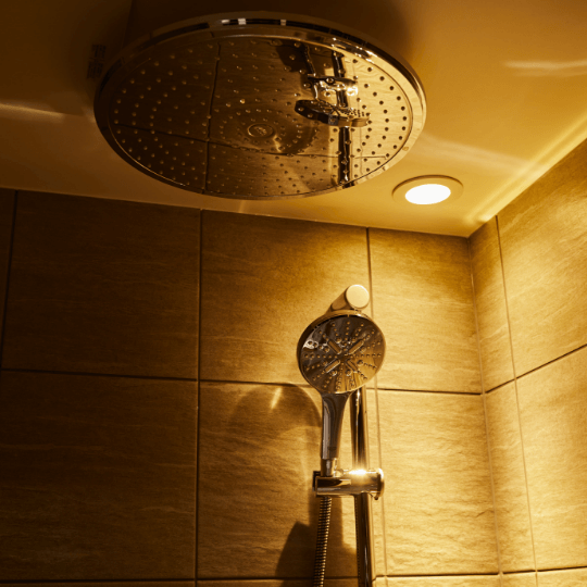 チラー(冷却水循環装置)によって15℃程度に冷やされた冷水を、グローエ製の400口径オーバーヘッドシャワーから大量に浴びることができます。
